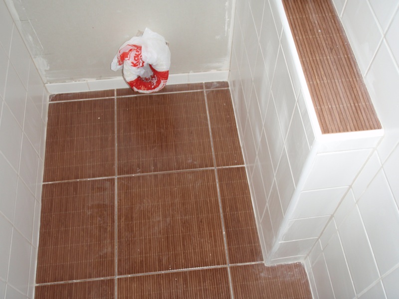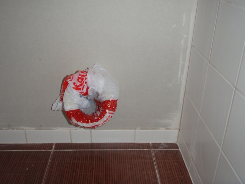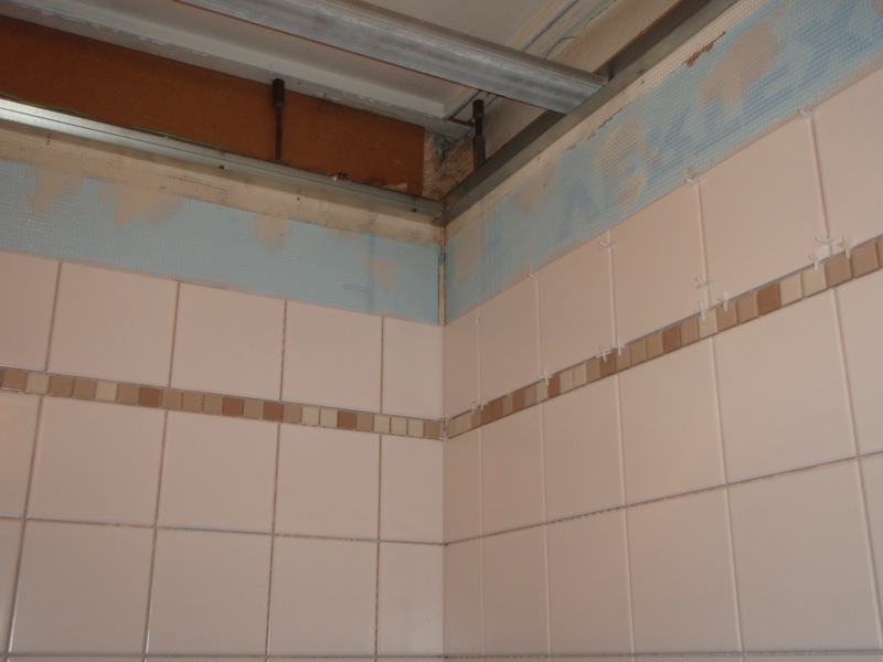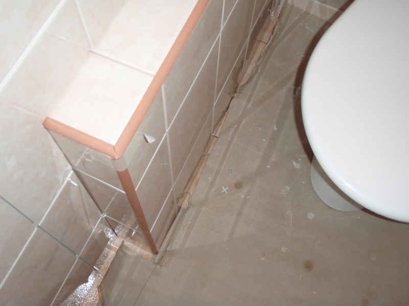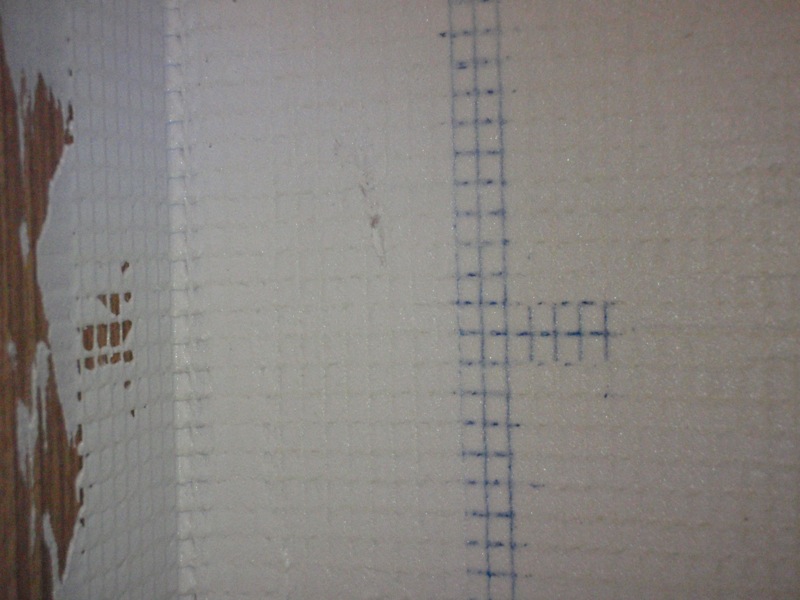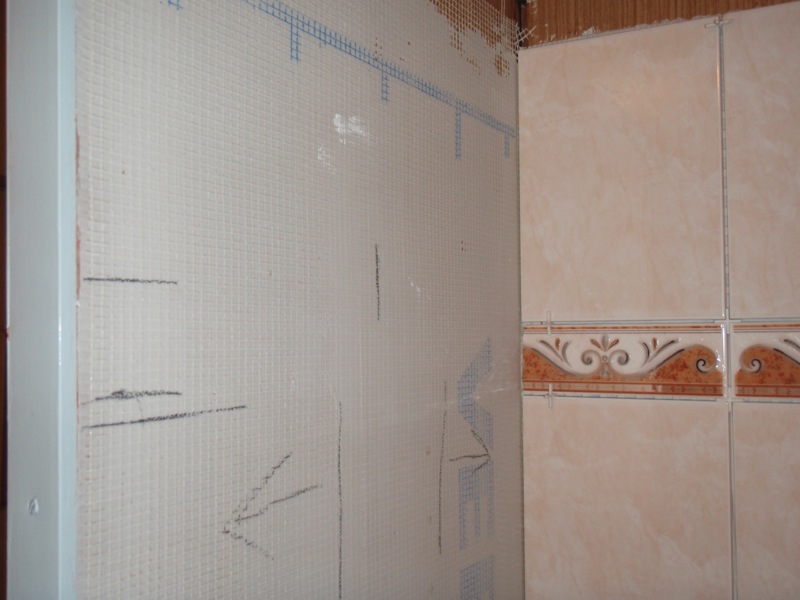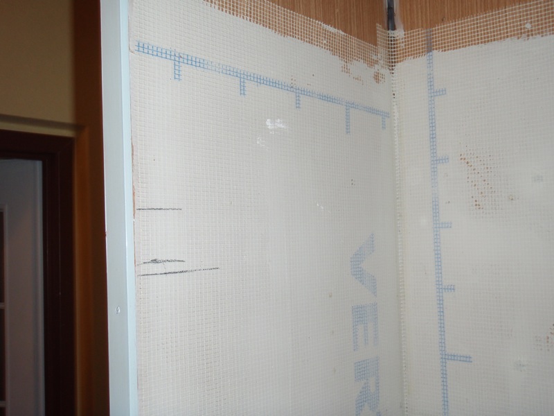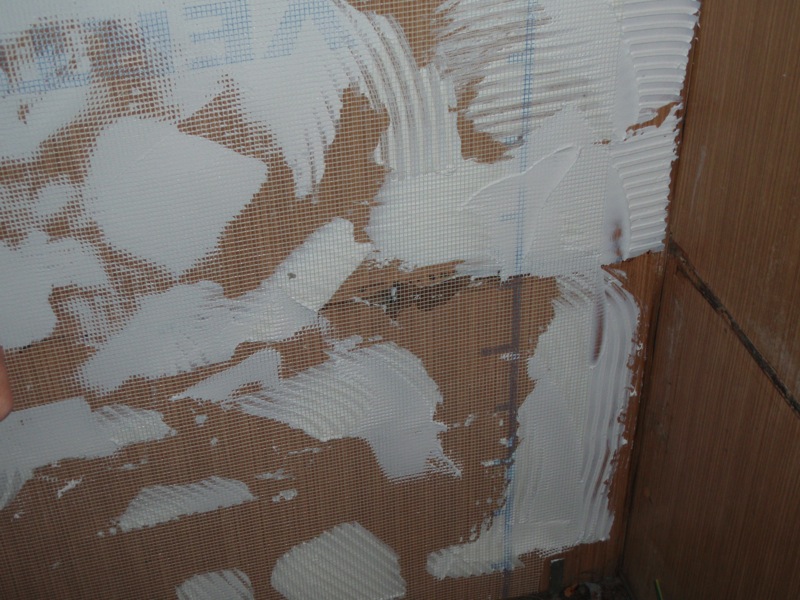 - Nátěr stěn v koupelně penetrací, nalepení perlinkového pletiva na umakartové stěny a potažení perlinky disperzním tmelem.